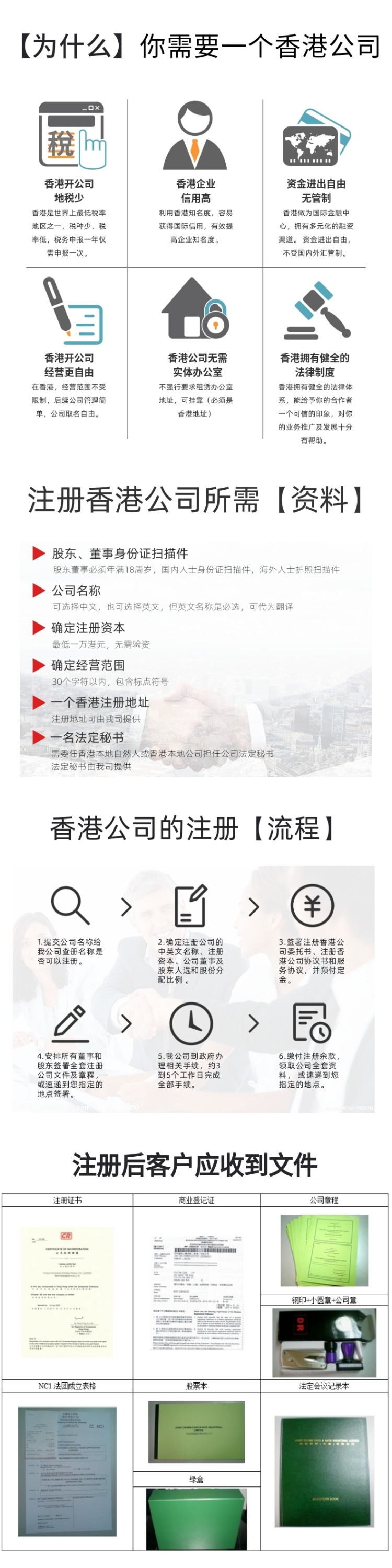 包含注冊(cè)證書、商業(yè)登記證、政府法定文件NC1文件、公司印章(小圓章簽名章、鋼?。?、